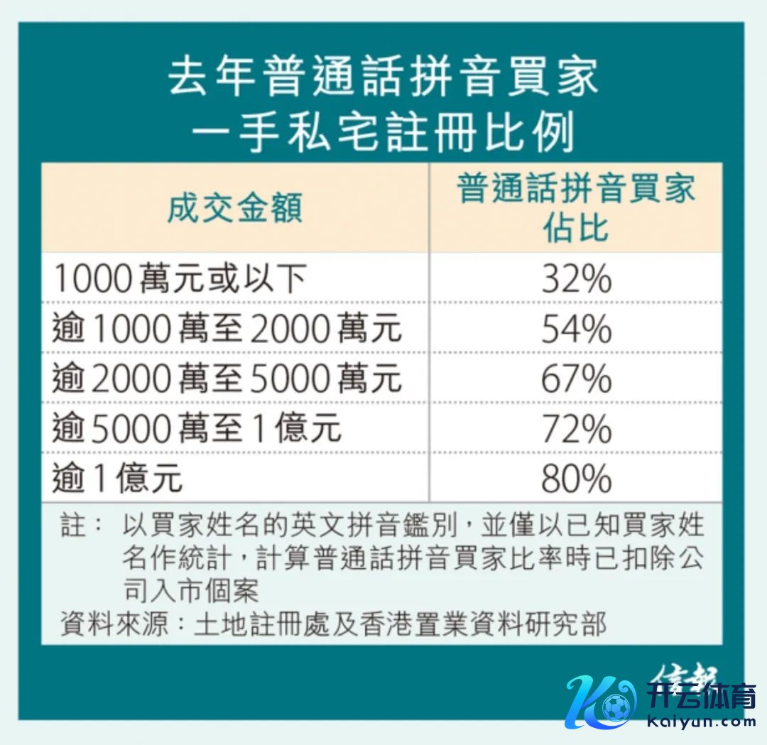 另外,香港置业考虑部董事王品弟以为,旧年下半年本港连番减息,以及中央提振经济要领出台等,进一步带动内地买家在港购买一手住宅物业,超等豪宅尤其获取内地富豪喜爱。香港置业数据败露,若以成交金额作分裂,旧年造价逾一亿元的一手住宅物业成交中,有约80%买家是平方话拼音买家,意味每5宗成交有4宗为此类买家;造价逾5000万至1亿元的成交中,平方话拼音买家也占72%。
