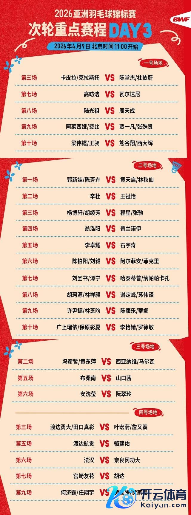2026年亚洲羽毛球锦标赛今天(9日)迎来第三个比赛日,将于北京时分中午11时开赛。